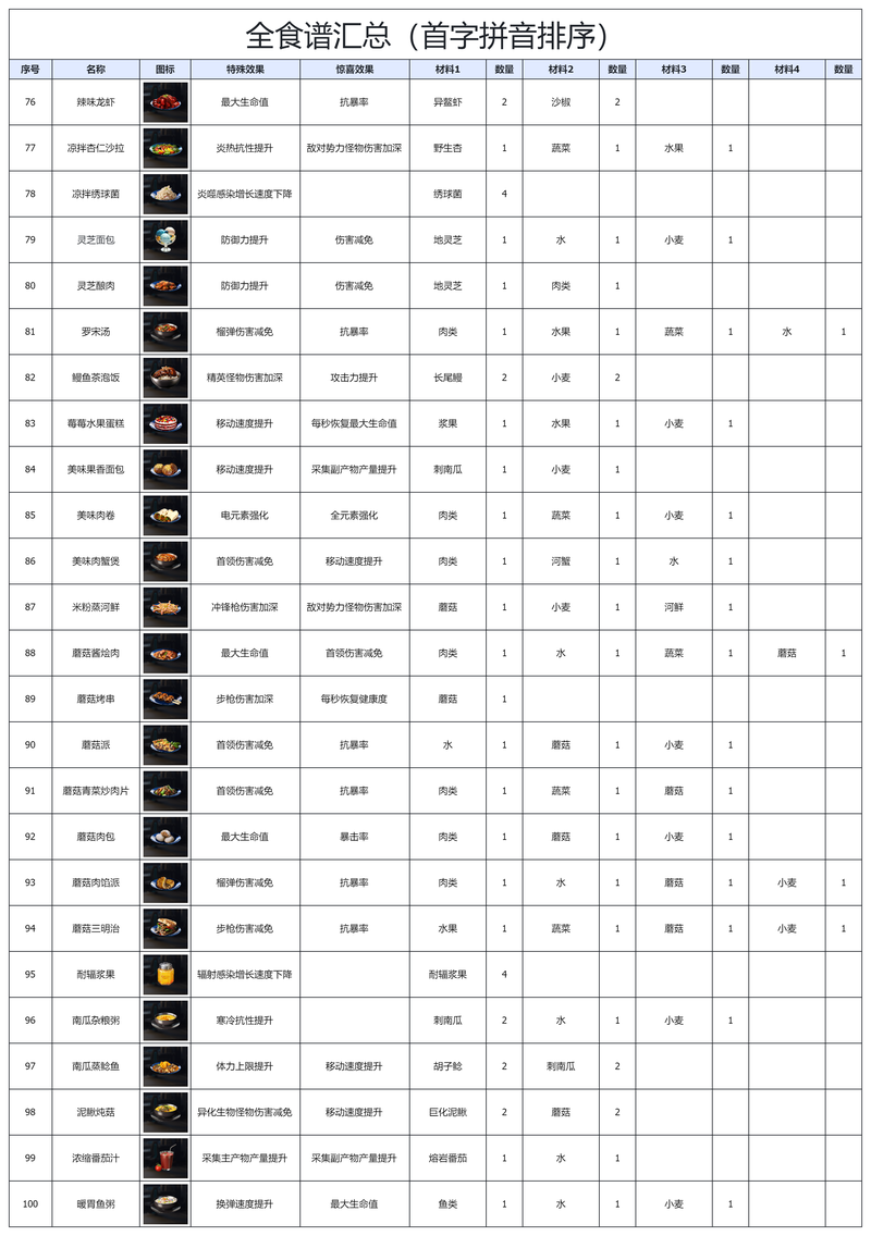 星球:重启50级版本【食谱汇总】(杜加河谷~开普勒港)「别错过」星球 重启 50 级版本 食谱汇总 杜加河谷 开普勒港 如下 说在前面 1 总表按食物首字拼音顺序 a z 排序 2 飞 书文档将持续更新 且可使用查找功能 图鉴党可通过...