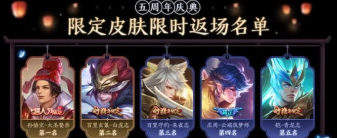 王者荣耀五周年返场皮肤多少钱[亲测有效]王者荣耀五周年返场皮肤多少钱 王者荣耀五周年返场皮肤投票结果已经出来了 那么五周年返场皮肤多少钱呢 下面是小编为大家整理的王者荣耀五周年返场皮肤价格介绍 一起来看看吧 王者荣耀五周年返场皮肤多少...