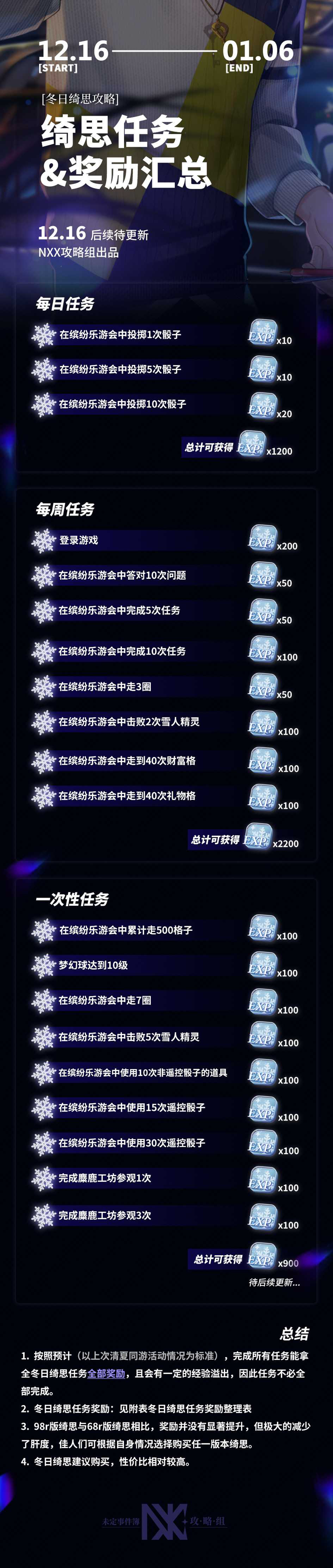 未定事件簿【冬日绮思活动任务及奖励汇总】(待更新)未定事件簿 冬日绮思活动任务及奖励汇总 待更新 如下 冬日绮思活动任务及奖励汇总 待更新 如果你想在本次游玩中获得最佳的游戏体验 你应该知道这些 游玩时间 如何更高效分配 游玩奖励如何...