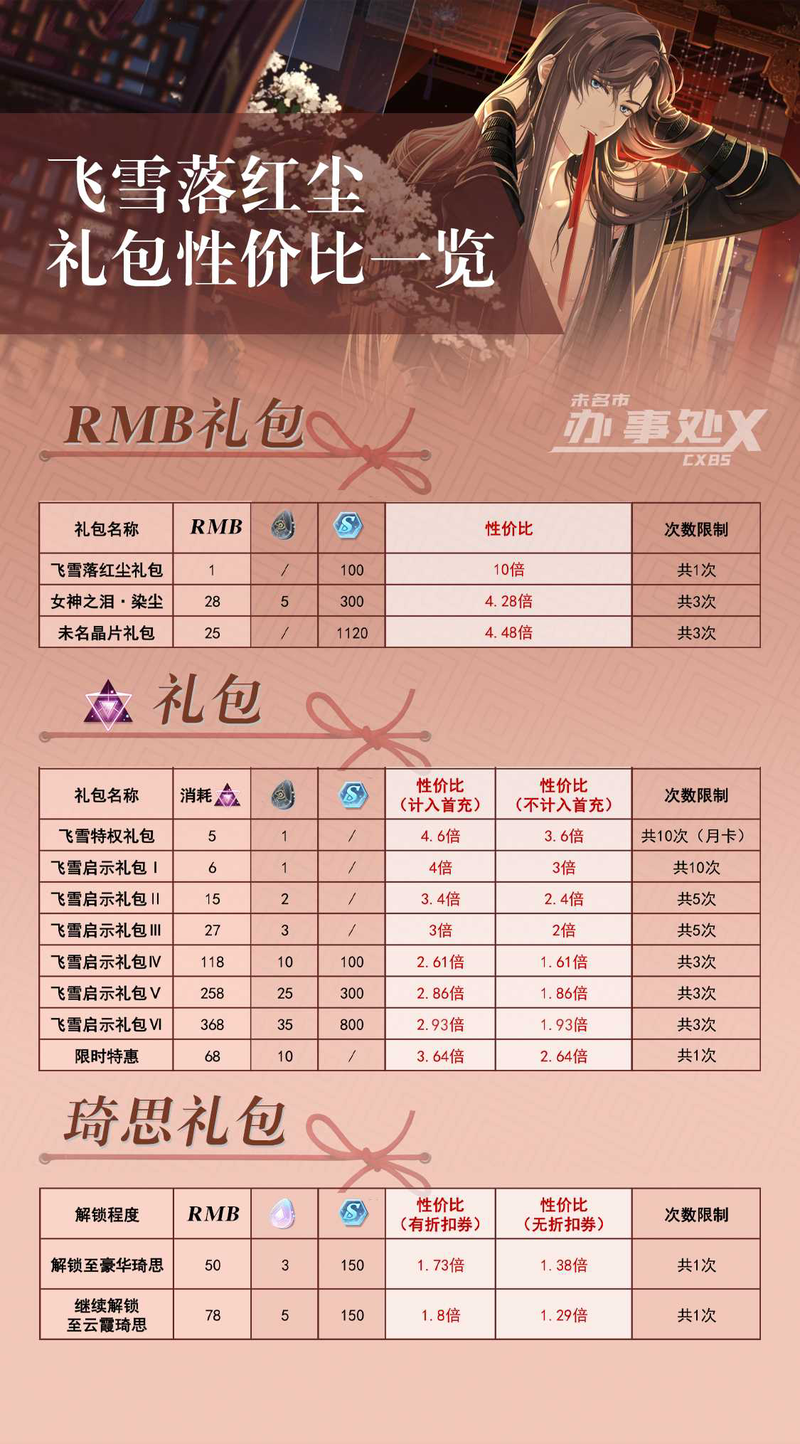 未定事件簿【飞雪落红尘】礼包性价比一览未定事件簿 飞 雪落红尘 礼包性价比一览如下 过年好啊各位 划掉 经历了一下午的手忙脚乱鸡飞狗跳之后 我们 cxbs 终于肝出了这份礼包性价比 吹着不和煦的风 马上就要迎来春节了 祝大家红包多多 ...