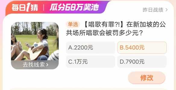 淘宝每日一猜答案2024年2月19日2024 淘宝每日一猜活动 2 月 19 日的问题是在新加坡的公共场所唱歌会被罚多少元 不少小伙伴想知道 2 月 19 日这道题目的答案是什么 接下来就让我们一起了解一下淘宝每日一猜的答案吧 淘宝大...