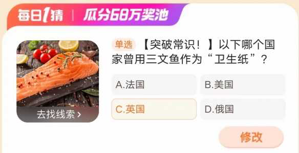 淘宝每日一猜答案2024年3月3日[亲测有效]2024 淘宝每日一猜活动 3 月 3 日的问题是哪个国家曾用三文鱼作为卫生纸 不少小伙伴想知道 3 月 3 日这道题目的答案是什么 接下来就让我们一起了解一下淘宝每日一猜 3 月 3 日...