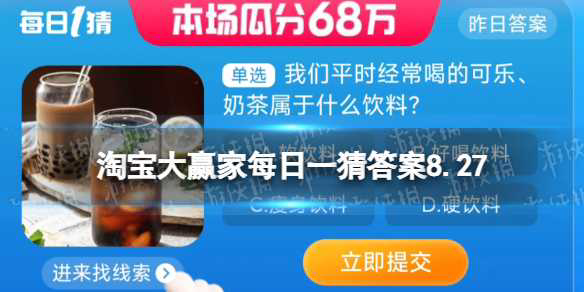 我们平时经常喝的可乐奶茶属于什么饮料 淘宝大赢家每日一猜答案8.28「必看」2023 淘宝每日一猜活动初夏踏浪季 8 月 27 日的问题是 我们平时经常喝的可乐奶茶属于什么饮料 不少小伙伴想知道 8 月 27 日这道题目的答案是什么 ...