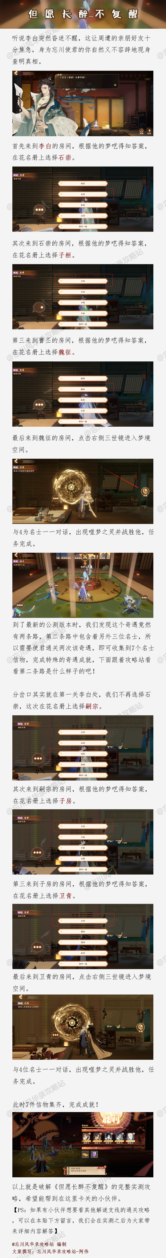 忘川风华录《忘川风华录解谜任务:但愿长醉不愿醒》忘川风华录 忘川风华录解谜任务 但愿长醉不愿醒 如下 改良版来了 在热心使君的提醒下 我们发现这个奇遇还有另一条支线 达成了两条支线的使君可以完成一个成就 因此我们重新给大家整理了两条支...