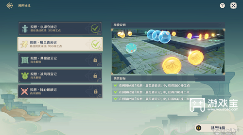 原神神工天巧宝录之章第二天满分攻略原神神工天巧宝录之章第二天主题为履见青云记 需要玩家分数达到 845 分才可以获得全部奖励 游戏宝小编带来原神神工天巧宝录之章第二天满分攻略 原神神工天巧宝录之章第二天满分攻略 1 开启挑战后 上平台...