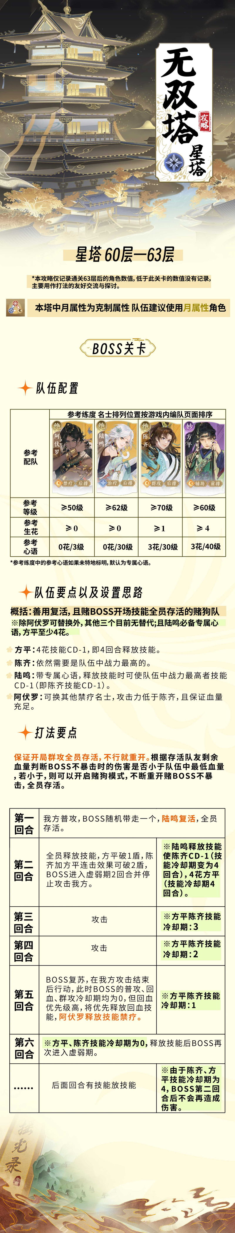 摇光录:乱世公主【无双塔-星塔】攻略摇光录 乱世公主 无双 塔 星塔 攻略如下 公主殿下日安 今日奉上无双塔攻略 本次攻略鸣谢 非典型小黑 猫 本次攻略覆盖范围为 星塔 60 63 层 的普通关卡和 Boss 关卡 具体配置可查看图片...