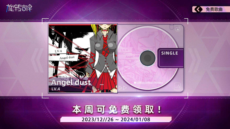 旋转音律连续4周领限免单曲!全新单曲「Angel dust」已上架!旋转音律 连续 4 周领限免单曲 全新单曲 Angel dust 已上架 如下 共庆此时 连续 4 周领限免单曲 本周可领 Angel dust by LV 4 领取...