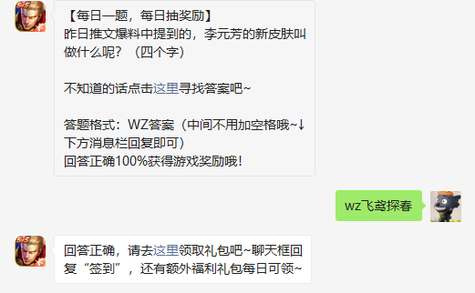 昨日推文爆料中提到的李元芳的新皮肤叫做什么呢四个字每日一题 每日抽奖励 昨日推文爆料中提到的 李元芳的新皮肤叫做什么呢 四个字 不知道的话这里寻找答案吧 答题格式 WZ 答案 中间不用加空格哦 下方消息栏回复即可 回答正确 100 获...