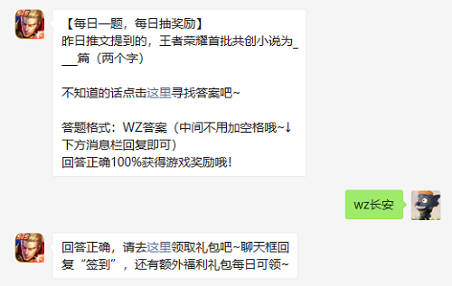 昨日推文提到的王者荣耀首批共创小说为篇两个字[亲测有效]每日一题 每日抽奖励 昨日推文提到的 王者荣耀首批共创小说为 篇 两个字 不知道的话这里寻找答案吧 答题格式 WZ 答案 中间不用加空格哦 下方消息栏回复即可 回答正确 100 ...