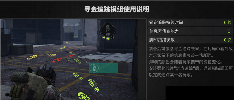 萤火突击战术目镜芯片集-寻金追踪模组「必看」萤火突击 战术目镜芯片 集 寻金追踪模组如下 模组说明 装备后可激活寻金追踪效果 在对局中看到敌方玩家留下的信息素痕迹 脚印 模组情况 以上就是萤火突击 战术目镜芯片集 寻金追踪模组相关内容