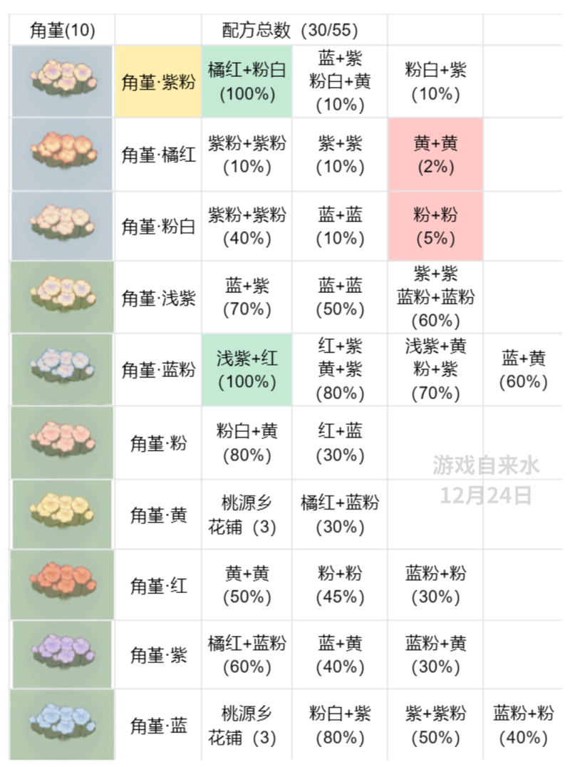 桃源深处有人家【最新最全桃源花配方】(12月24日)桃源深处有人家 最新最全桃源花配方 12 月 24 日 如下 概率是玄学 我这是真的概率 不是钓鱼 时间 那个假概率 一种配方测试十次 一种花五六十次 高的甚至一百多次 测试至少使用...