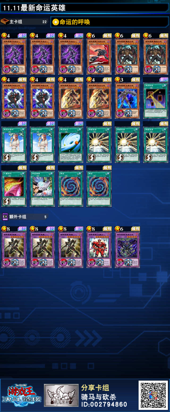 游戏王:决斗链接最新自创命运英雄构筑试用游戏王 决斗链接最新自创命运 英雄 构筑试用如下 相对来说比较标准的一套卡 但是还有优化的空间 个人感觉就是最好多来二重旋风替换夜射和银河风 因为二重旋风可以连锁融合和变化发动 相当于不要代价的...