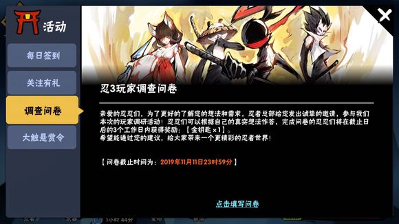 忍者必须死3双十一金钥匙礼包「别错过」忍者必须死 3 手游双十一金钥匙礼包在哪领 忍者必须死 3 在双十一也为大家带来了一个调查问卷的金钥匙福利 福利内容也是非常丰富 下面小编就带来了忍者必须死 3 手游双十一金钥匙礼包领取地址 还没...