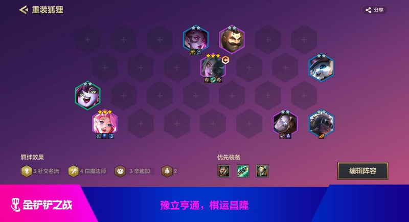 金铲铲之战【T0阵容】重装名流狐狸金铲铲之战 T0 阵容 重装名流狐狸如下 羁绊 4 白魔 法师 3 社交名流 3 辛迪加 提示 推荐名流位在第二排位置时选择 此阵容 阵容优点 前期用约德尔打工 8 人口即可成型 主 C 狐狸副 C ...