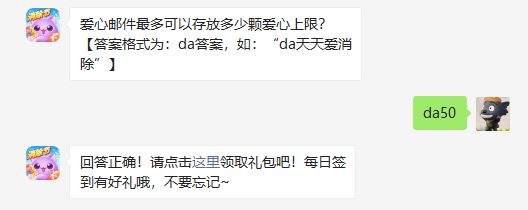 爱心邮件最多可以存放多少颗爱心上限「必看」爱心邮件最多可以存放多少颗爱心上限 答案格式为 da 答案 如 da 天天爱消除 这是天天爱消除 5 月 29 日每日一题 游戏宝小编为您带来正确答案 爱心邮件最多可以存放多少颗爱心上限 答案...