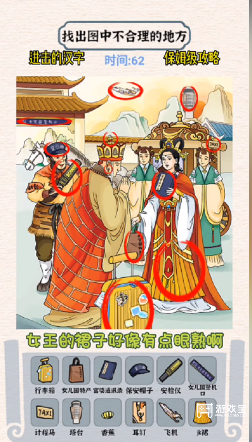 进击的汉字找出图中不合理的地方攻略唐僧进击的汉字找出图中不合理的地方关卡里 玩家需要在图片里找出十二处不符合场景的道具 游戏宝小编带来进击的汉字找出图中不合理的地方攻略唐僧 一起来看看吧 进击的汉字找出图中不合理的地方攻略唐僧 1 行...