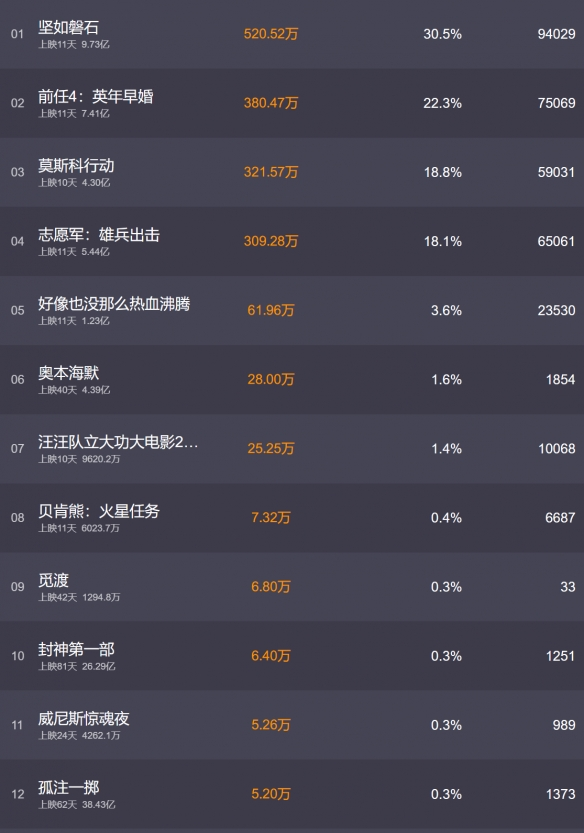 电影票房排行榜10月19日 志愿军雄兵出击等国庆档电影票房排行榜10 月 19 日的电影票房情况怎么样 10 月 19 日目前在映的依旧是 前任 4 英年早婚 坚如磐石 等几部国庆档电影依旧在上映中 那么接下来就让我们一起了解一下 1...