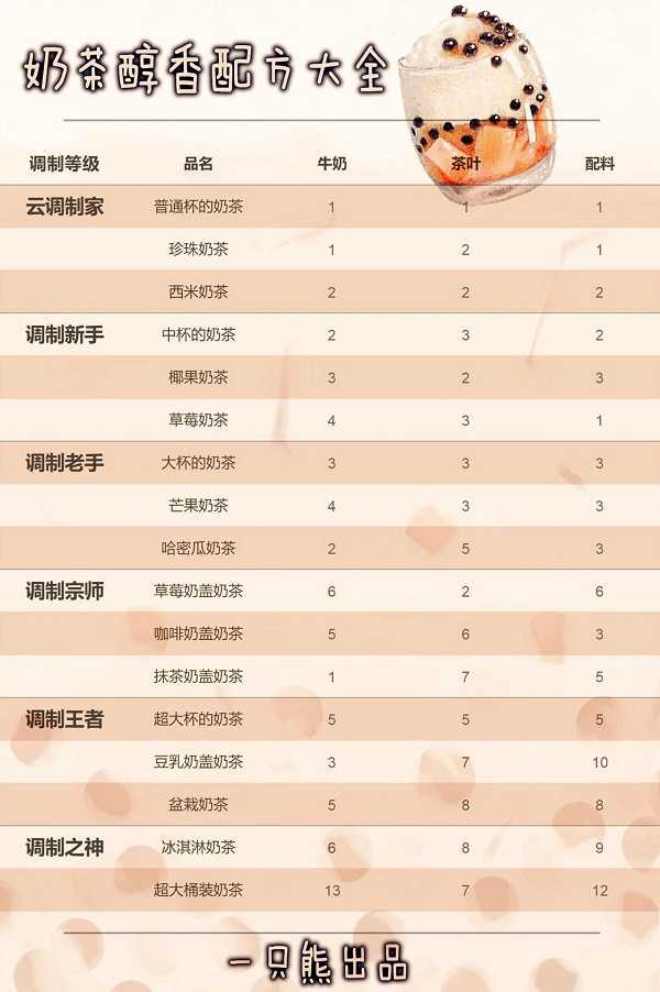 暗夜兵团奶茶配方攻略大全暗夜兵团奶茶是需要指定的牛奶 茶叶 配料来制作的 因此很多玩家想知道暗夜兵团奶茶配方怎么做 游戏宝小编为您带来暗夜兵团奶茶配方攻略分享 暗夜兵团奶茶配方攻略大全 1 如上图所示 各种奶茶的配方都在图中说明了 大...