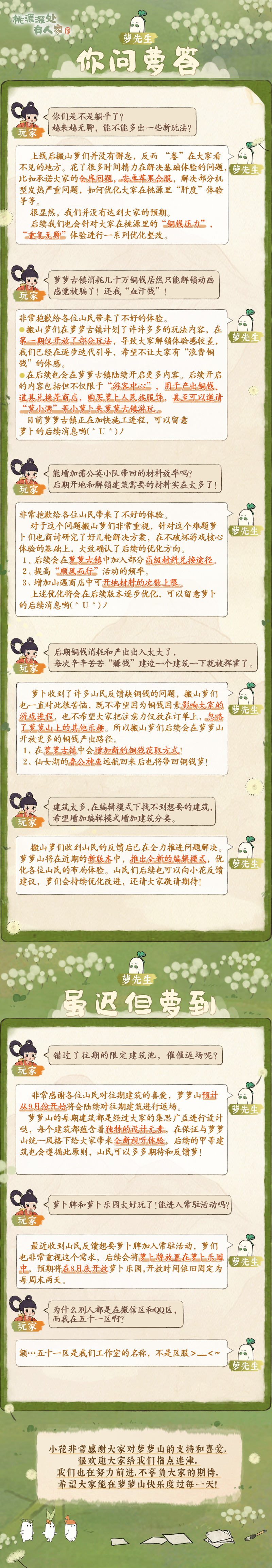 桃源深处有人家搬山萝答疑解惑丨第一期桃源深处有人家 搬山萝答疑解惑丨第一期如下 各位萝萝山山民好呀 近期小花收集了许多山民的建议和反馈 搬山萝们将山民的意见反复思考学习 为此 搬山萝答疑解惑 栏目上线 萝 为了解决山民的疑惑 萝卜将以...