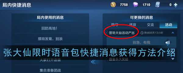 王者荣耀张大仙限时语音包怎么获得[玩转游戏]王者荣耀张大仙限时语音包怎么获得 游戏中有不少的语音包都非常有趣 那么怎么获得张大仙限时语音包呢 下面跟着小编一起看看吧 王者荣耀张大仙限时语音包获得攻略 张大仙限时语音包 参加营地大仙活动...