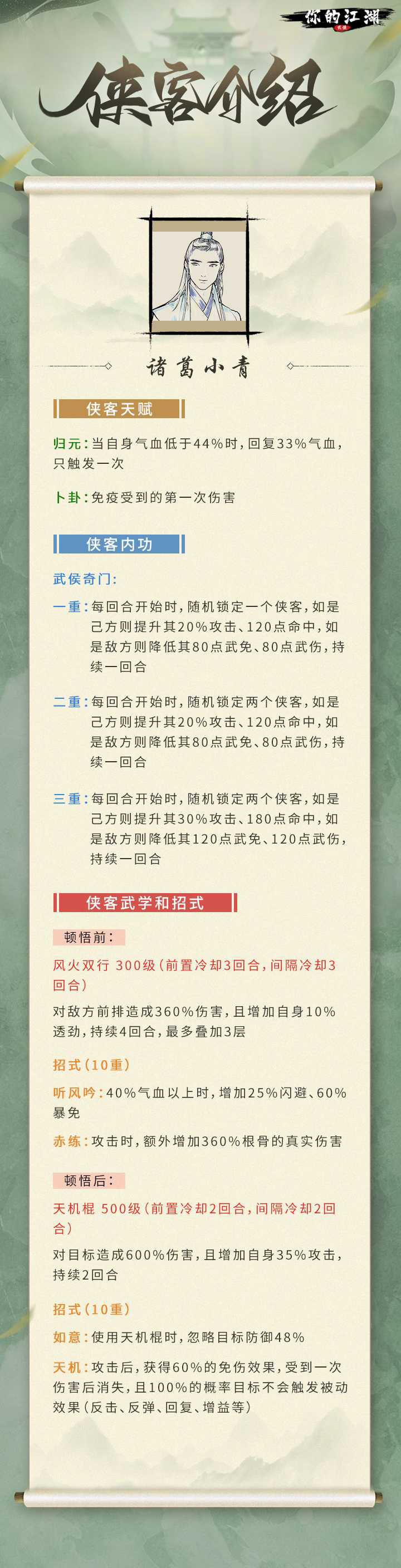 你的江湖侠客信礼伍 - 天机百变——诸葛小青「别错过」你的江湖 侠客信礼伍 天机百变 诸葛小青如下 诸葛后代 武侯传人 是八卦村里几十年来唯一掌握全部武侯奇门的人 诗号 遁甲传人 诸葛后人八卦村 不世天才小阿青 天地人神四盘法 奇门巽...