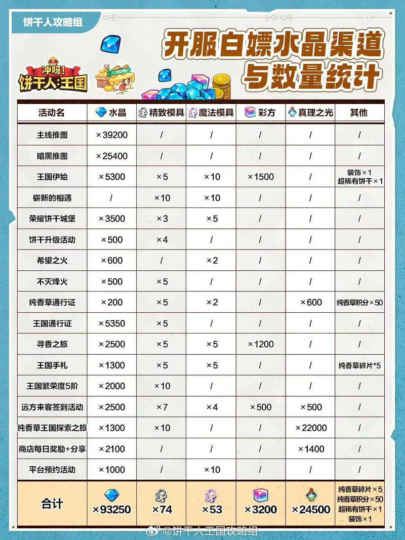 冲呀!饼干人:王国开服白嫖水晶渠道与数量统计「必看」冲 呀 饼干人 王国开服白嫖水晶渠道与数量统计如下 整理了一份纯白嫖可以拿到的资源量以及获取渠道 主要统计水晶 模具和真理 之光 其中大多任务有肝完的要求 注意 以上就是冲呀 饼干人...
