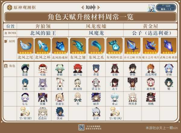 《原神》1.3角色及武器天赋升级材料一览原神 中角色与武器的天赋升级是很重要的 因为升级后可以使角色及武器带来非常高额的伤害 那么现在为大家带来 天上一颗 xin 分享的 原神 1 3 角色及武器天赋升级材料一览 希望对大家有所帮助 ...