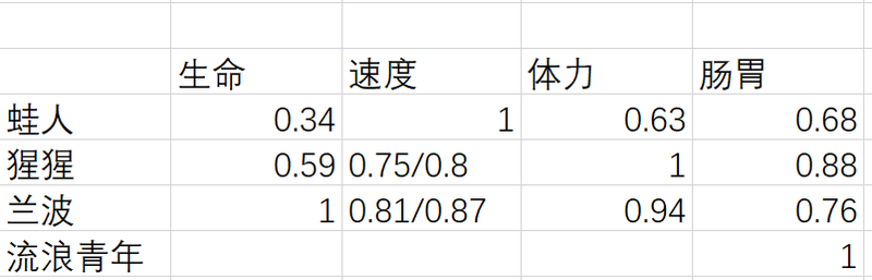 枪手:丧尸幸存者蛙人、猩猩、兰波数值对比枪手 丧尸幸存者蛙人 猩猩 兰波数值对比如下 三个人物的详细数值 幸运 未测试 幸运为闪避几率 时间比例为 1 360 现实 1 小时 游戏 360H 数值 速度 前为走后为跑 值越小速度越快 ...