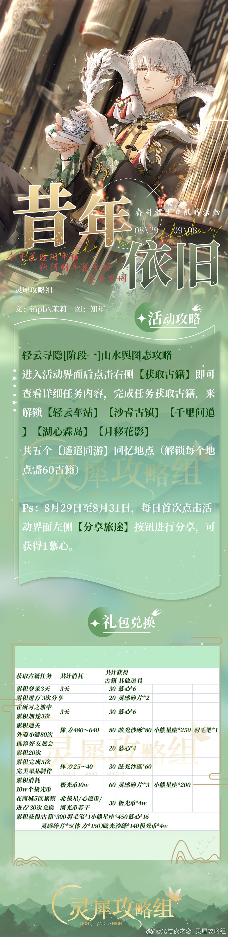 光与夜之恋齐司礼生日限时活动——昔日依旧光与夜之恋 齐司礼生日限时活动 昔日依旧如下 一些小提示 1 外婆总计刷 80 关 五区商店 30 次 完美制作 5 次 展会点赞 20 次 累计消耗十万金币 分享三次 研习加速三次 登录三天 ...