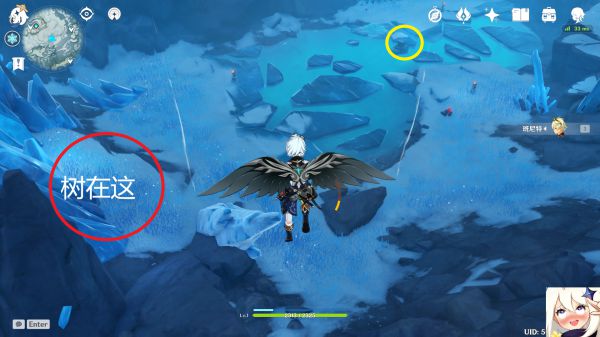 下来后看下图,红圈是树的位置,但是靠近不了,得打完黄圈处的一个挑战(挑战限时)建议先找三条金龙鱼把柱子点亮了再打,