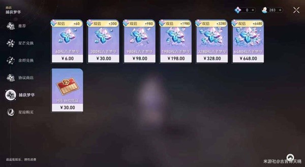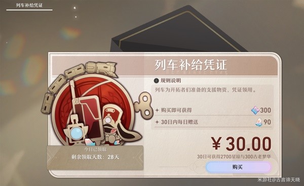 2.性价比等于付费项目可换取的星琼(游戏内的付费代币、抽卡资源)或开拓力(刷资源所需的体力)的数量与实际销售价格的比值。例如领满30天的小月卡可换取3000个星琼,实销价格30元,前者与后者之比为3000/30=100,则小月卡的性价比为100。本帖所说的性价比可以简单理解为一元能换多少星琼或体力,即以数量/元为单位。
