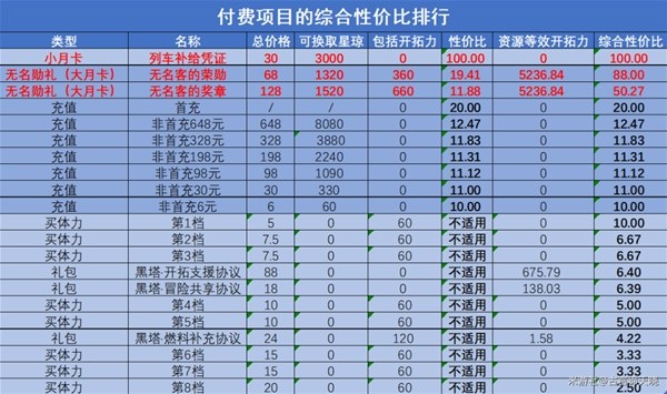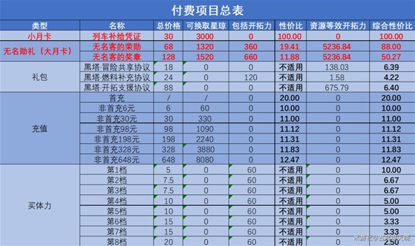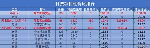 综合性价比高于50的在表内会标红。除大小月卡外,各项目的综合性价比都不超过20,可见大小月卡的性价比非常之高!