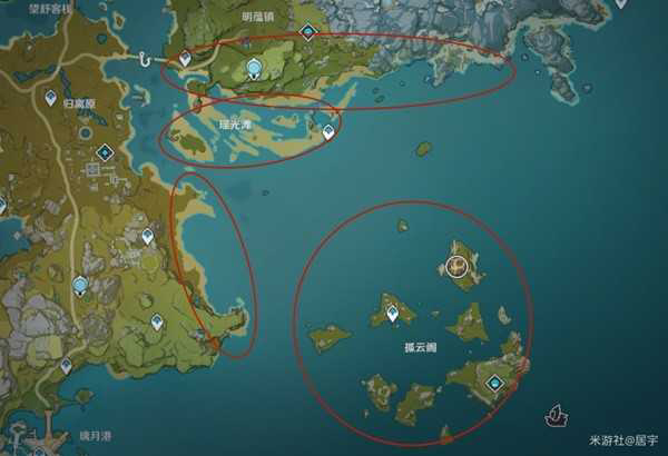 分布在孤云阁、瑶光滩、归离原东侧海滩、明蕴镇与龙脊雪山南侧海滩