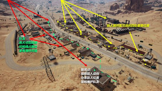 首先如果选择火车站发育的话,一定要注意有没有同行的敌人,因为这会直接影响到你后续搜索物资的时间,毕竟火车站处于地图的北上方,如果被敌人偷袭或卡住导致损员或逗留太久都会让你们后续进圈充满风险。不过如果有敌人和你们一同前往火车站也不用慌,先和队友商量好抢下图上所示的南半区,这样敌人势必会被逼向北半区。