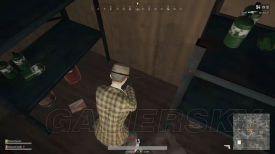 走到厕所最里面,鼠标准心对准架子上的两个绿色瓶子。