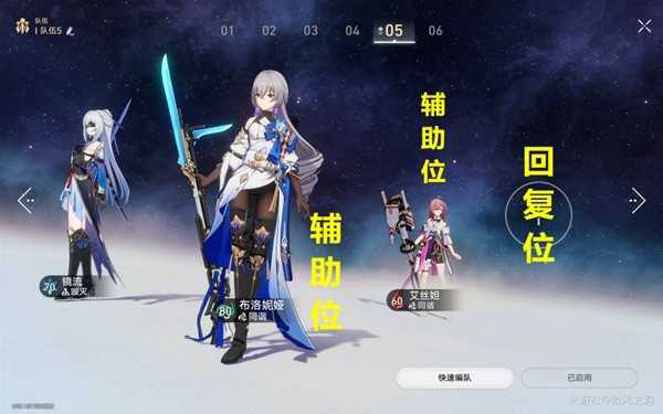 常规队:镜流+辅助+辅助+回复。该队伍适合材料不多,角色养成不是那么足的情况下进行的常规队伍。也就是二辅一回复。特别是萌新角色不多的情况下,可以用自己有的角色尽可能的配队。队伍整体成本也相对低了很多。遗器就还是选择冰套较好。