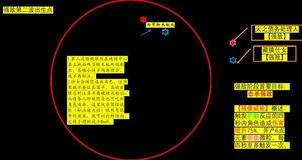 小怪为盗宝团阵营,为便于旅行者辨识怪物,图例括号中注解了怪物的武器或特征。【残像威能】激发前,场上小怪始终为5个,第一、二波往复刷新。详见图A。小怪阶段以凑反应数为第一要务,注意不要被锤硬直或冻结。图中蓝色箭线为大体走位轨迹,在箭头位置即可着手扩散。