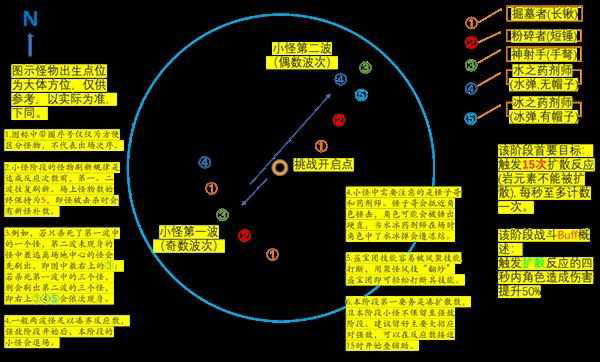 今天我们继续分析挑战中的走位要点,具体技能释放操作因队伍而异,此不详述。走位打法上,楼主观察游戏内挑战的怪物规律后,制作了绝路挑战的大致的怪物刷新点位图,操作说明已附在图中。(若图片字小不清,可图片后缩放阅读。实在不能看清的,可在评论区留言,楼主将会在评论区誊写复述。)