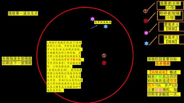 两波强敌都将在小怪第二波④⑤附近刷出,这附近地面有一处尾端搭在一起的两节断木板。推荐第二波小怪刷出后,将怪聚在此附近,可免去频繁走位。旅行者可以此为参照点在反应数将要凑齐时在木板中间提前就位叠阵(叠好辅助准备输出)。强敌详情见图C和图D。