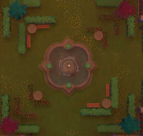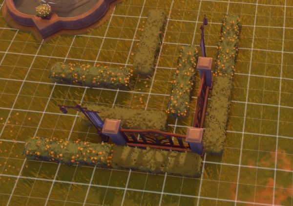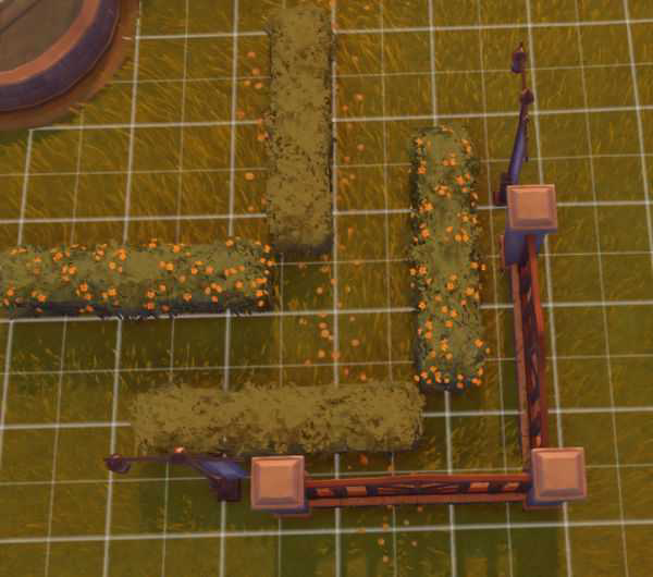 然后紧贴着围墙放下两个平平无奇的灌木丛,贴着灌木放下两个正逢花期的灌木丛