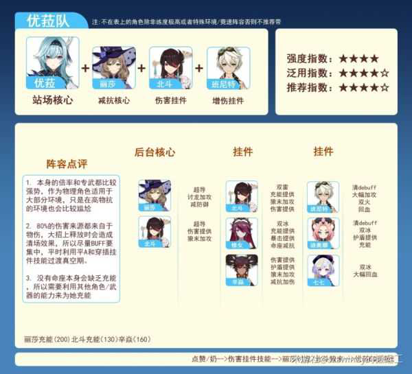 而实战中双冰体验是优于双雷的,是否带双雷则看自己是否带点赞,如果不带点赞的话双雷双冰的体感也很不错,毕竟有些人点赞腾不出来或者满命了。对于优菈来说虽然点赞仍然有提升,但因为配合专武白值高的原因,有无点赞的差距也不是那么大。