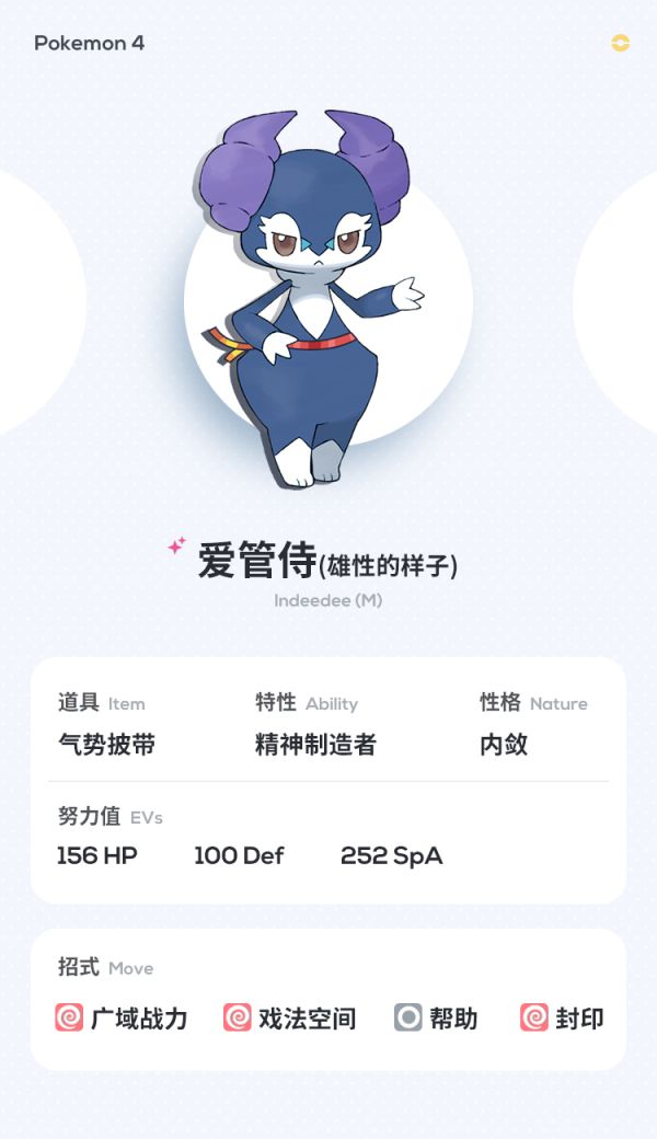 这是一直专门开空间的爱管侍,日常搭配波克基斯和武道熊师首发,因为大部分队伍要么都是顺风要么总体速度偏上,这都是我方队伍难以支架的,所以基本用戏法空间来为我方获得优势,同时公的爱管侍的优势是我可以开空间也可以不让你开空间,操作性大幅增强,有时候还能先读对手反开空间,我们可以先手封印防止对方反开,因为要兼顾输出和开空间,所以携带气势披带。也因为爱管侍在这个队伍中速度是偏中间,有时候可能会因为速度线而尴尬,所以可以通过帮助给先攻的队友来获得大威力先手攻击