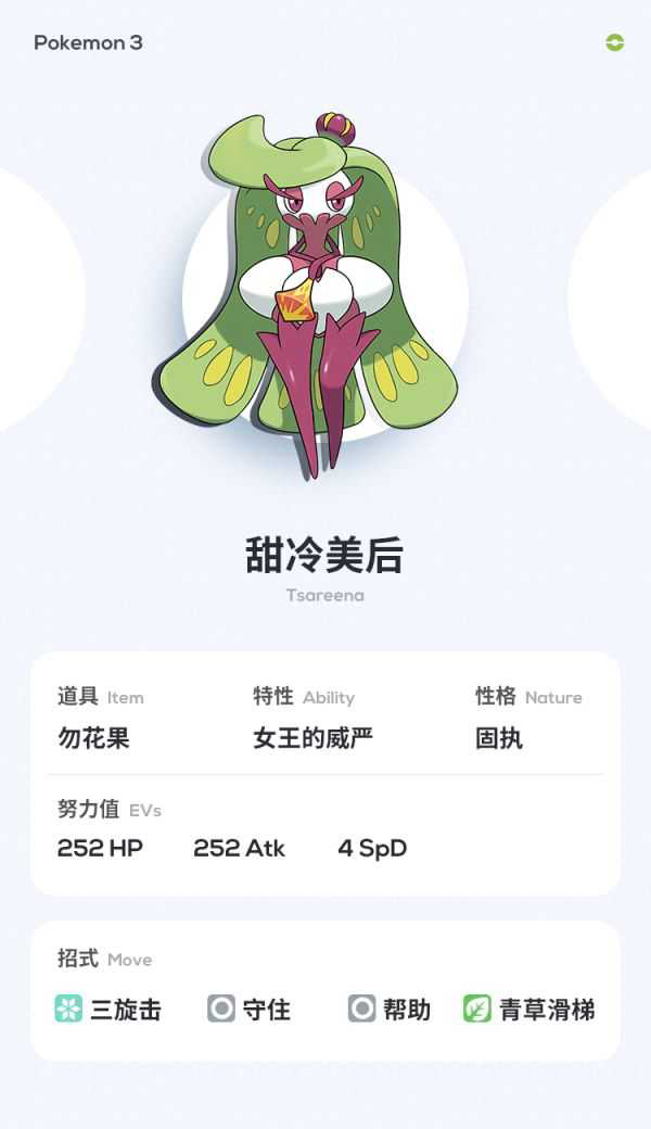 武道熊师最怕的宝可梦是什么?那自然是轰擂金刚猩,也因为现在的金刚猩逐渐只携带青草滑梯,所以防止金刚猩的先制技能成为刚需,这时候甜冷美后就是完美防金刚猩的宝可梦,女王的威严让你使不出先制滑梯,但是我可以用你开出来的草场对你滑梯,这是非常爽的一件事情,建议金刚猩恐惧患者都带上。同时甜冷美后能学会三旋击,也让甜冷美后拥有了有效打击飞行系、草系的手段,而且甜冷美后120的物攻种族可不是盖的,上来利用草场收残是非常好用的!有很多时候除了武道熊师以外,掩护布莉姆温的输出也是甜冷美后重要的作用。
