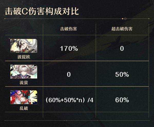 乱破是目前唯一一个自带击破加成的同时,又自带超击破加成的C。而且也是目前唯一一个本体不吃点的击破C,同时还能对未被弱破的敌人造成击破伤害,这非常惊人。整体的设计都在摒弃击破C的一些缺点,那么代价是什么呢?代价就是乱破的跨弱点输出能力几乎打对折。