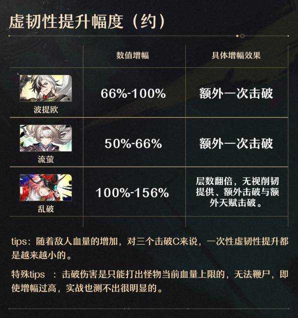 其实流萤、乱破、波提欧在各自的优势环境中,削韧量都不算低。不过流萤和波提欧有植入弱点的能力,且流萤对没弱点的目标也能造成的55%的削韧。而乱破本身没有植入弱点的能力,无视弱点削韧也只有50%。