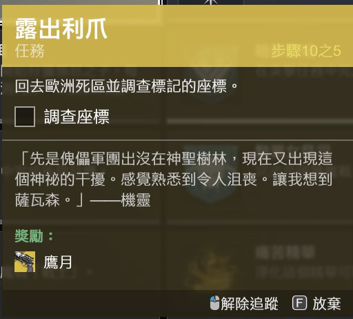和乌鸦对话后再回欧洲死区开始调查坐标任务,暗指示收集四个超因果羽毛,在乌鸦的闺房里看完剧情后,出门左转下落来到类似暗影之湖尾王的地方,用地上的球砸破傀儡BOSS的盾,打掉一小段血后BOSS跑路,掉落第五个羽毛,拾取后完成任务