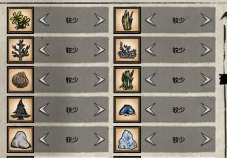 在这个世界图纸设置里头,各种资源,植物资源啊,动物资源啊,都可以设置成较少,挑战真正的“饥荒”。