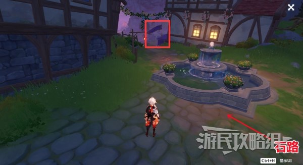 传送到双双岛传送锚点,往北边沿着石路走到喷泉处。