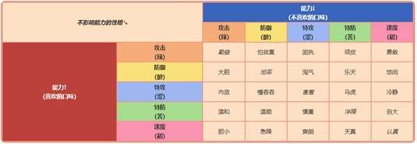 性格:宝可梦的性格会增强它的一项能力,同时减弱一项能力,幅度为±10%。当增强与减弱的能力相同时,能力没有任何变化。第八世代起,可以通过薄荷来改变增强和减弱的能力(但并不改变宝可梦的性格)。以下是未使用道具前性格对宝可梦能力和喜欢口味的影响: