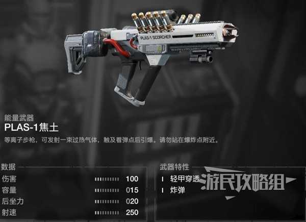 在标准战争债券的第10页解锁,解锁时间较晚,算是表现最好能力武器,还有主宰,在机器人关卡的表现非常神,打虫子建议携带焦土,如果是机器人则携带主宰。
